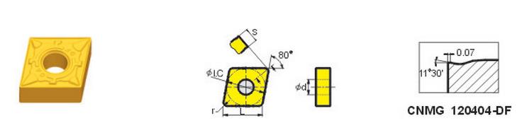 CNMG090304-DF(YBC151):高耐磨性的基體與MT-TiCN、厚Al2O3、TiN涂層的組合;是鋼、鑄鋼和不銹鋼材料精加工在高速切削條件下的理想牌號;